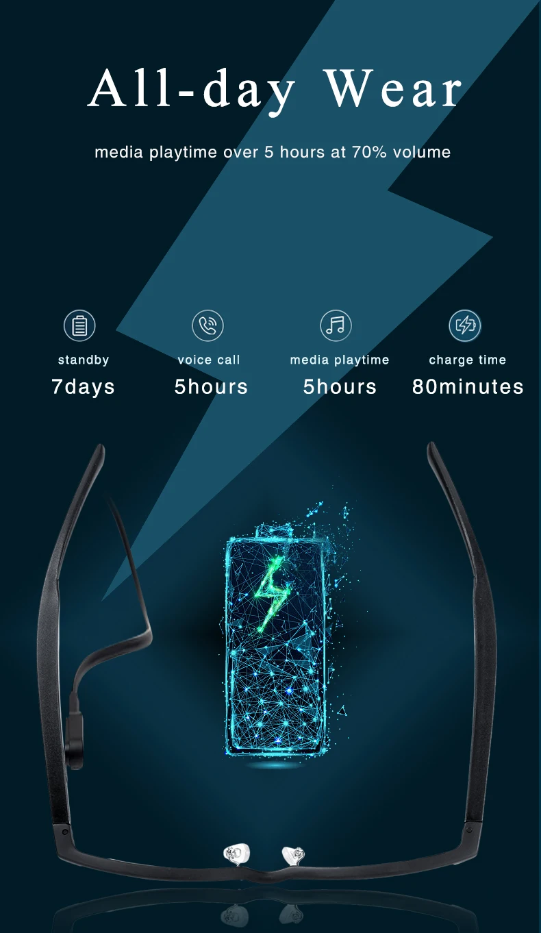 5.【Long Working Time】Meagtlva bluetoth glasses built in rechargeable 100mAh battery that can sustain a clear call for about 4 Hours, can play about 4 hours of music, standby time is about 150 hours, charging time is only 1 hour.